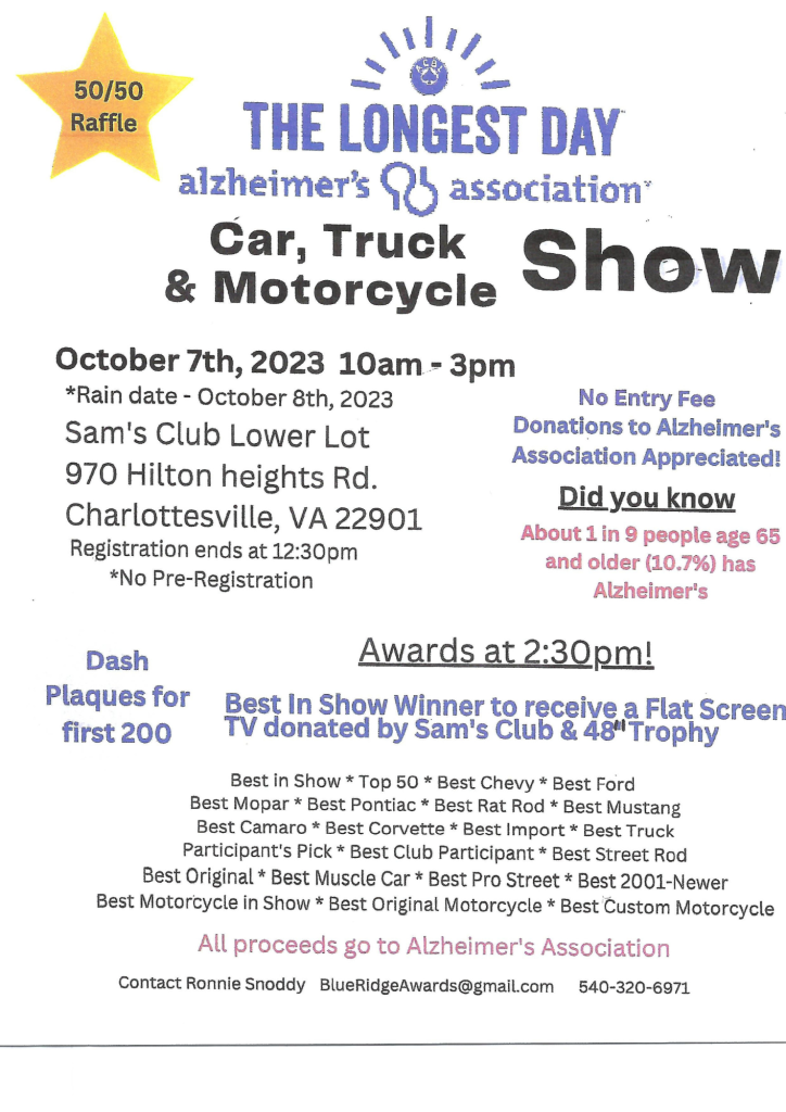 GET READY FOR THE HUGE CAR, TRUCK AND MOTORCYCLE SHOW TO BENEFIT THE ALZHEIMER’S ASSOCIATION, ON SATURDAY OCTOBER 7TH AT THE SAM’S CLUB LOWER LOT IN CHARLOTTESVILLE. IF NECESSARY, THE RAIN DATE WILL BE SUNDAY, OCTOBER 8TH. THERE’S NO CHARGE TO REGISTER SHOW VEHICLES – BUT DONATIONS ARE APPRECIATED. DASH PLAQUES AWARDED TO THE FIRST 200 ENTRANTS AND THE BEST IN SHOW WILL RECEIVE A FLAT SCREEN TV DONATED BY SAM’S CLUB, PLUS A 48 INCH TROPHY. OVER 70 AWARDS TO BE GIVEN OUT AT 2:30 PM. ALL DONATIONS BENEFIT THE ALZHEIMERS ASSOCIATON TO HELP STOP THIS TERRIBLE DISEASE. THERE WILL BE A 50/50 RAFFLE, PLUS FOOD AND BEVERAGES! SO DON’T MISS THIS SPECIAL CAR SHOW FOR THE ALZHEIMER’S ASSOCIATION!